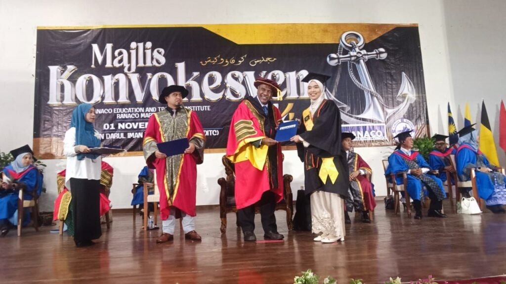KEMAMAN: Pelajar Diploma In Occupational Safety and Health (DIOSH), Muhammad Amirul Hadi Mat Ali menerima Anugerah Khas Kapten Ramlan dan Anugerah Perdana Tahun 2024 pada Majlis Konvokesyen Ke-14 Ranaco Education and Training Institute (RETI) dan Ranaco Marine Sdn. Bhd. (RMSB) di Dewan Dato’ Seri Tuan Guru, Darul Iman Training Centre (DITC), Telok Kalong, di sini, semalam.