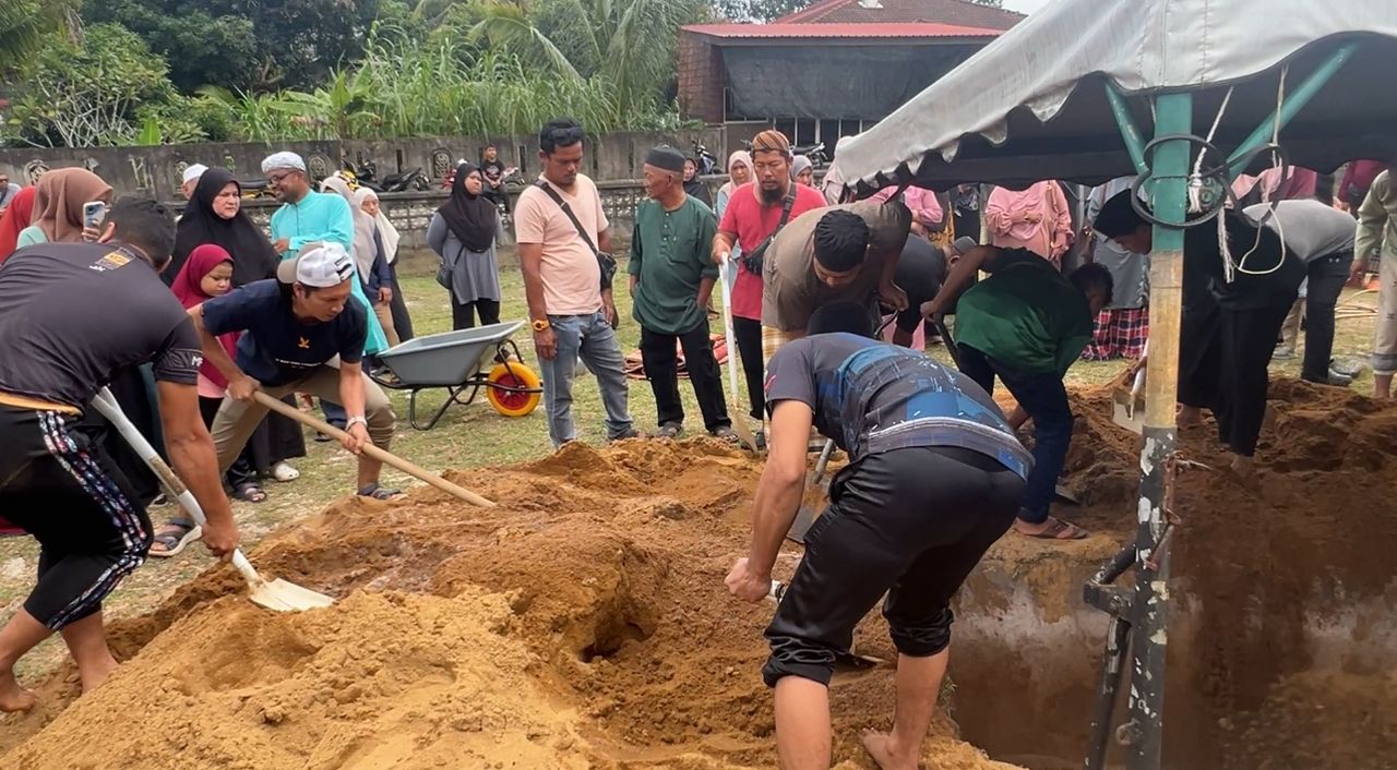 Kira-kira 200 ahli keluarga dan penduduk kampung turut berada di tanah perkuburan untuk memberikan penghormatan terakhir.